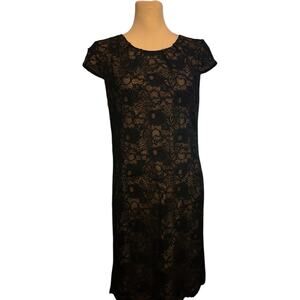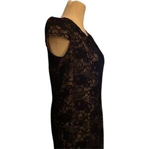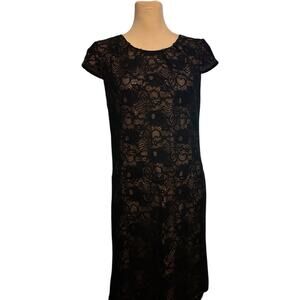 Gerard Darel Women's Black Eyelet Lace Sheath Dress, Size 4. Elegant and timeless, this black lace dress by Gerard Darel is a sophisticated wardrobe staple. Features a sheer floral lace overlay with a nude lining for contrast, short sleeves, and a round neckline. The tailored silhouette offers a flattering, feminine fit, perfect for cocktail events, evening outings, or formal occasions. Excellent condition.