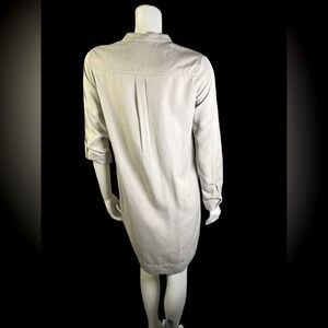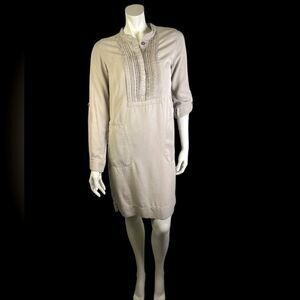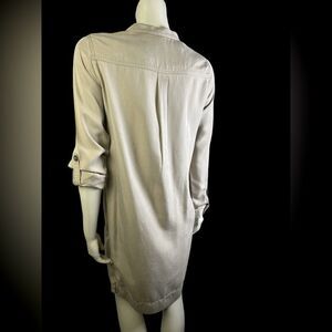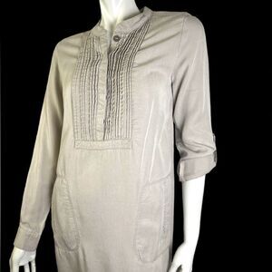 This classic tux-inspired relaxed tan tunic/dress is easy to wear, looks great on many body types, and features Accordion pleating, a half placket 5 button closure, a half band collar and 2 front slit pockets. It’s silk, long-sleeved, but also has buttons and tabs for optional rolled sleeves with wood buttons. The size 36 IT (US 4) measures as follows:
