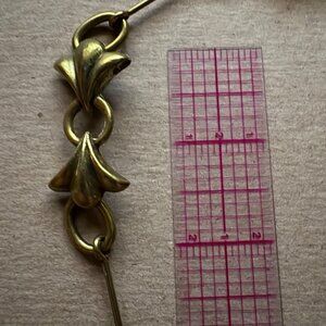 This long statement necklace exemplifies his signature style, featuring brass contoured fleur de lys motifs, rings, crystal rondelles and olive green serpentine beads interspersed with brass chains, bars and caps hanging from a round chain