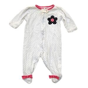 Gerber 100% cotton navy, pink, and off-white footed one-piece with flower applique. Full zip with snap-tab closure. Size 0-3 months.