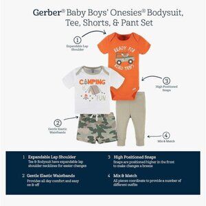 Gerber Baby Boys Camping Fun 4-Piece Bodysuit Tee Shorts & Pant Set Newborn Cott