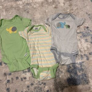 In excellent condition, all three onesies included. Cute elephant print. Brand is Gerber size 0-3 months