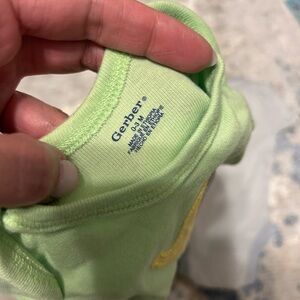 Adorable Gerber baby one piece set featuring a green, striped, and gray design. Perfect for keeping your little one comfortable and stylish.
