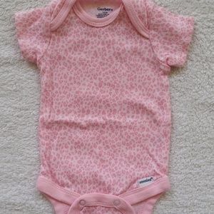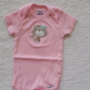 Set of 3 bodysuits from Gerber. (1) pink cheetah print (2) white with kittens (3) pink with kitten applique. Set is in excellent condition. Size: 0-3 months Materials: 100% cotton.