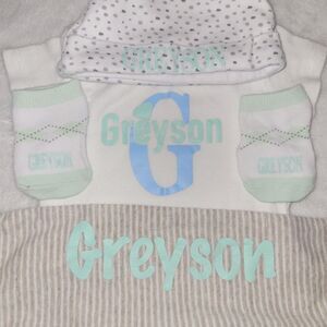 short sleeve onesie, pants, socks, hat and wrap button long sleeve all with the name GREYSON added to it