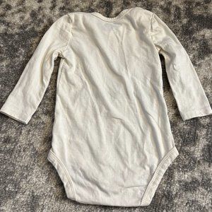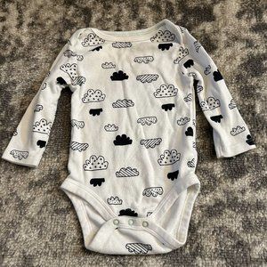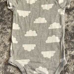 This listing is for three baby onesies. All three are in size 3-6 months. The first one is gray with short sleeves and pattern of clouds. It is made by Gerber. The second one is white with long sleeves. On the front are five adorable monsters. It says, "Monster Friends." It is made by Land of Wishes. The third one is white with long sleeves. It has a pattern of black clouds. It is made by Cloud Island. They are preowned, in very good condition. They come from a smoke free home. All items are laundered prior to departing my home.