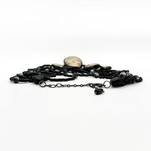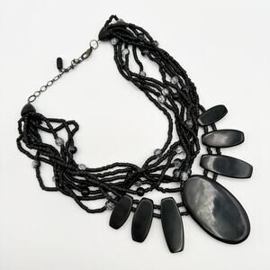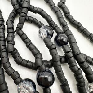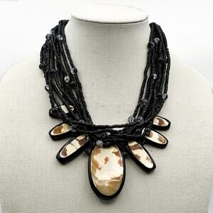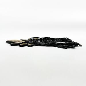 This stunning Gera Lynggaard (Denmark) for Monies statement necklace is made of coconut shell with abalone inlay and multi strands of tiny black beads with a sprinkling of round two-tone black & clear sparkle lucite beads and an adjustable length lobster clasp. Monies is known for its bold statement necklaces and large scale jewelry designs that use natural materials such as horn, wood, shell and semi-precious stones. This is one impressive collection piece. Not signed but an absolutely authentic Gerda Lynggasrd.