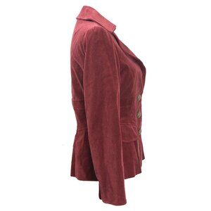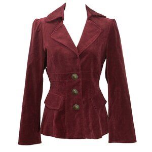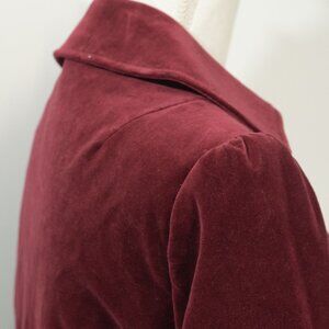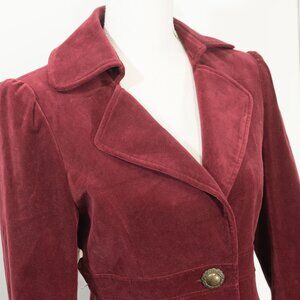 Gergiou Y2k Red Velour Jacket Hot Topic Victorian Steampunk Goth Fitted 70s Wine Blazer, size 8. NWT new with tags. This velvet blazer is a berry Cabernet color with a structured fitted Gothic or Whimsigoth Hot Topic silhouette that could go from western prairie core to steampunk and saloon.