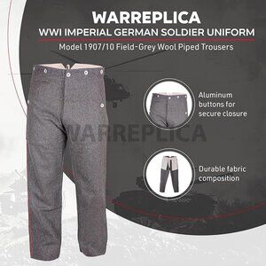 The German Model 1907/10 Field-Grey Wool Piped Trousers are a reproduction of the authentic World War II German military uniform. Made from 60% wool and 40% viscose in a field grey color, these trousers are designed to resemble the original issue. With a 40 inch waist, these trousers are a collectible item for enthusiasts of military history and militaria. The brand warreplica ensures the authenticity and quality of this historical piece of German military attire.