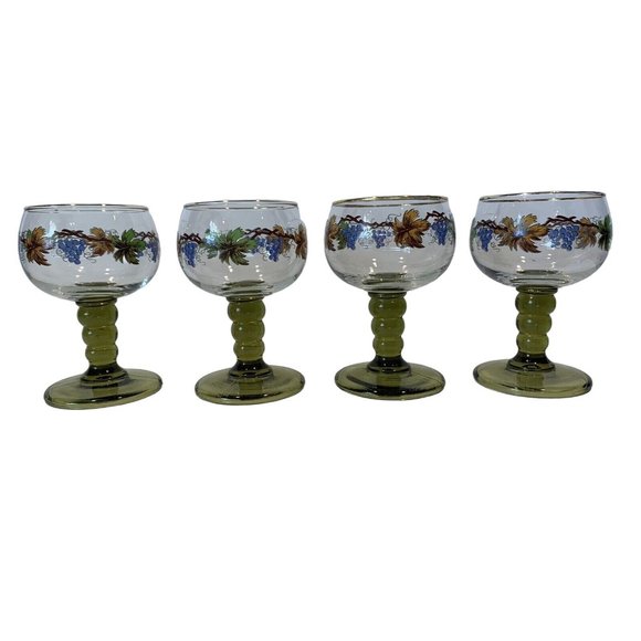 German Roemer Wine Glasses Green Stemmed Grapes Vines Leaves Set Of 4 Vintage