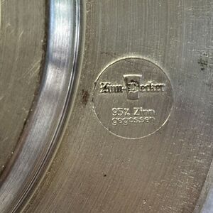 The back is stamped with "Zinn Becker" and "95% Zinn gegossen," which translates to "95% cast tin" in English. This indicates that the plate is made from 95% pure tin, and "Zinn Becker" is likely the manufacturer's mark.