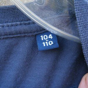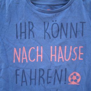 Blue t-shirt with German saying. It says "You could go home", with a soccer ball. Made by Tom Taylor. 100% cotton. Size 4-5. Bought in Germany. Size tag has Europe size on one side and American size on the back. For boys or girls. Good condition, no tears or stains. Design good. Great for any kid who likes soccer.