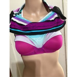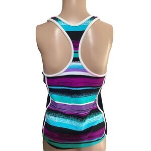 VGPC, zip neck, racer back, built in bra, teal, purple, black, and white, tagged size 8, See Measurements for Custom Fit