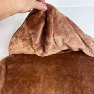 Hooded, long sleeve, zip up, front zip pockets, fuzzy inside and outside, fleece