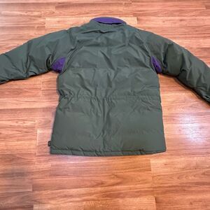 This jacket is Green puffer jacket. Has a lot of insulation for warmth. Shell and lining made with 100% nylon. Interlining made with 100% polyester. Insulation made of down. Length 32 inches, Chest pit to pit 25 inches. The sides have buttons that can tighten the waist or loosen for a comfortable fit. Jacket has many pockets and zippers. Pre-Owned-Great condition.