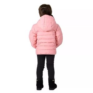 Stylish pink puffer jacket for kids. Features a cozy hood and front zipper.
