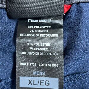 Lightweight men's navy shorts in XL. Made with a 93% polyester and 7% spandex blend for comfort and flexibility. Features an elastic waistband and a zippered back pocket.