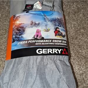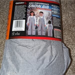 Gerry kids snow bibs in heather gray color. These are new. They have adjustable suspenders, scuff guard detailing, pockets, articulated knees, partial fleece lining, reflective detailing, inner elasticized cuff. These are water resistant and wind resistant.