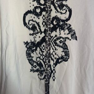 Long sleeve cream top with artistic black design: includes beads, abstract
