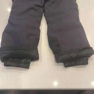 Durable gray snow pants. Bright blue adjustable straps. Perfect for winter activities.