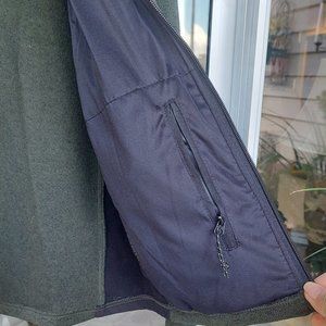 Motled rich olive green full zip Jacket. Has blacknone knit inserts over the shoulders and down the sides. 2 zippered ouside pockets and 1 zippered inside. In excellent /mint condition.