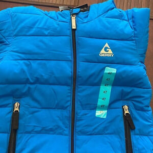 Blue or red insulated bubble jacket with attached hood and small Gerry logo on chest