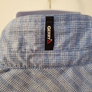 This is a Gerry shirt. It buttons up the front. There are two pockets on upper chest with button closures.