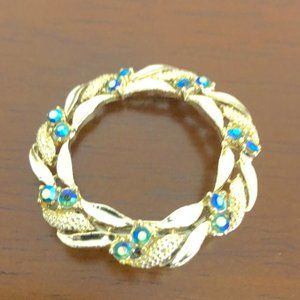 -This lovely, circular brooch features an elegant gold tone wreath with beautiful rhinestones in blue/greenish color.