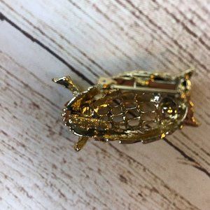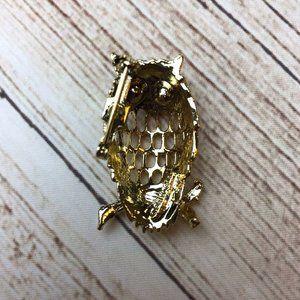 Cute gold tone owl brooch with red rhinestone eyes. Measures 1.5 inches x 0.75 inches at longest and widest points.