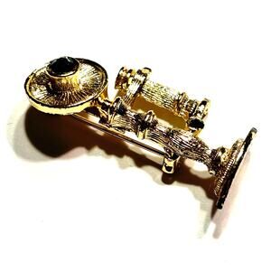 Vintage Gerrys scatter pin - a textured gold tone brooch shaped like an old fashioned telephone. This is a classic mid century look highlighted by tiny green rhinestones - clearly hallmarked. In excellent condition - no apparent damage or flaws - so cute!