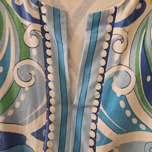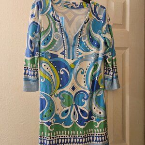 The dress is beautiful and blues and lime greens. You can wear this dress to a date or just to do errands because it's so comfortable.