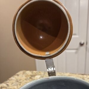 The mug is made of stoneware with a brown glaze and embossed lacing detail.