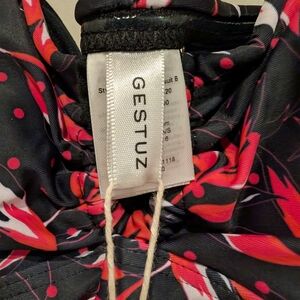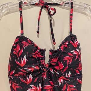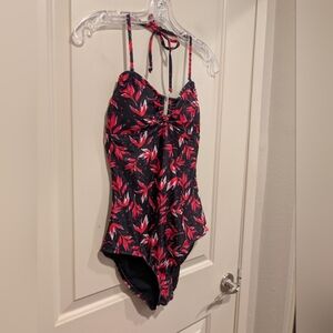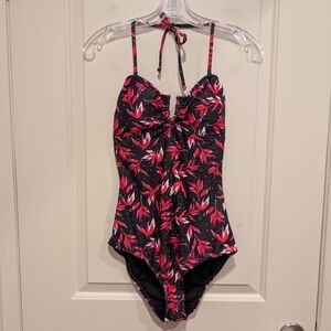 Stylish one-piece swimsuit with a vibrant floral pattern. Features shades of red and white on a black background. Perfect for a chic beach look.