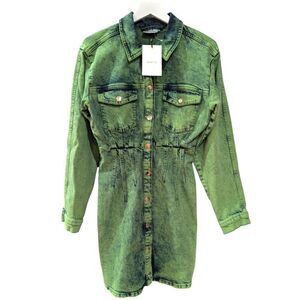 Stylish green denim shirt dress with button-down front. Features long sleeves and a classic collar.