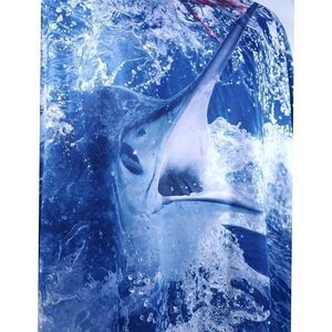 All over marlin fishing double sided graphic short sleeve tee. Marlin on front of shirt with two fishing reels and yacht on the back.