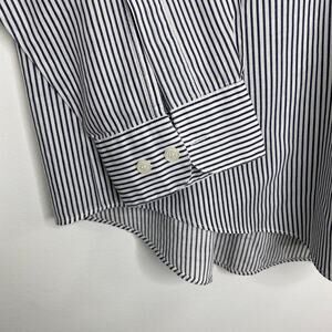 Blue and white striped button front shirt. Button down closure, collared neckline, long sleeves with button cuffs.