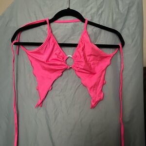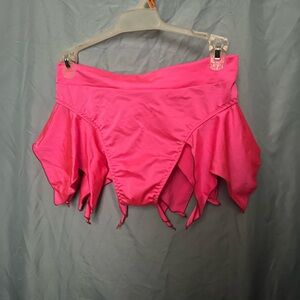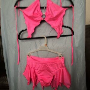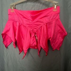 Get Ravy pink pixie 2-piece rave set. High waisted bottoms with flowy pieces on the hips. Tie top for easy size adjustment. Silver O-ring. Material is lightweight and comfortable. Worn once the hand washed and air dried.