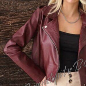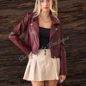 Get Your Motor Running Bold Bright Burgundy Sangria Soft Vegan Leather Zip Up Crop Jacket.