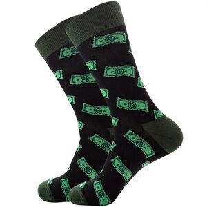 Add a playful touch to your outfit with these black and green socks featuring a fun money pattern.