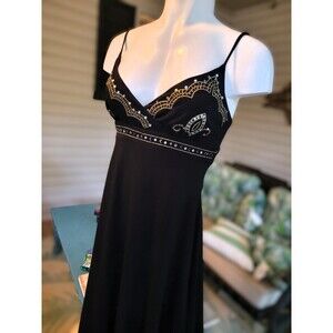 Gorgeous, black A- line dress, strong spaghetti straps, beautifully hand sewn beads and sequins in silver, bronze, gold, slate, across the bodice. Fitted across top of dress/ bodice, then a twirling flare. Top quality material with elastin for stretch & comfort. Gorgeous dress, very flattering design. There were a limited number of thw design produced. It is a nice crisp black with contrasting gold and silver accents at the bust.