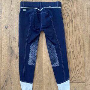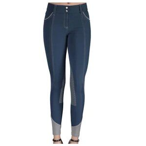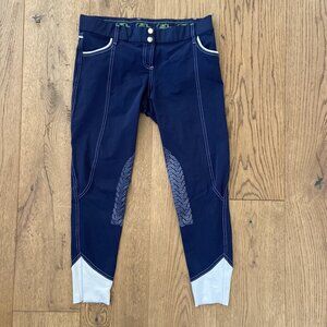 Stretchy soft hand feel fabric for maximum comfort with moisture wicking properties. The Elara breech features ultra figure flattering seaming and piping details, grippy geometric silicone knee patches, a soft flexible knit leg cuff for a form fitting feel under your riding boots, and our signature logo embroidery.