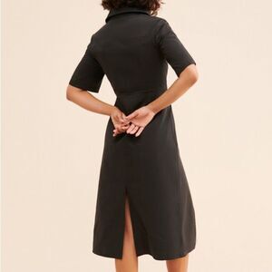 wide elbow-length sleeves and a midi skirt with slits at the front. Topped with a pointed collar.