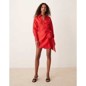 Ghospell Taffeta Wrap-Style Mini Dress With Tie Waist & Long Sleeves M+