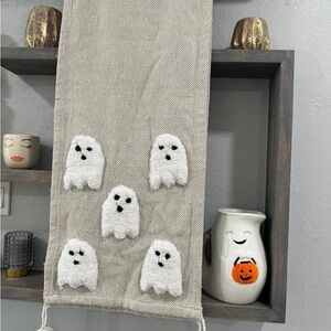 Charming ghost embroidery on a tan runner or you can use it as a bed scarf. Adds a whimsical touch to any decor.