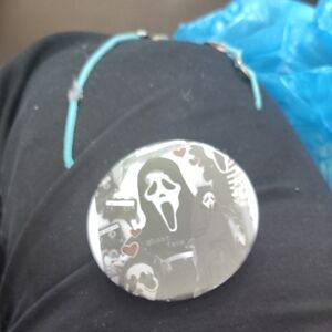 Round button pin featuring Ghost Face design. Black and white with red heart accents.