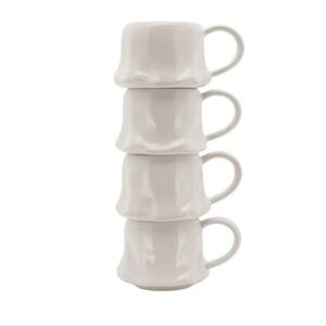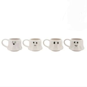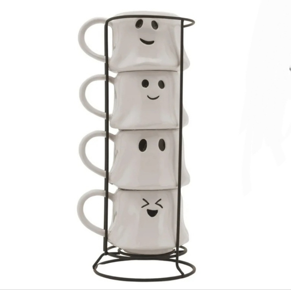 Brand new in box! Set of 4 ghost mugs, each featuring a distinct facial expression. Crafted from durable stoneware. Each mug holds 12.5 oz. Comes with an iron rack for easy stacking and convenient storage.