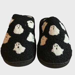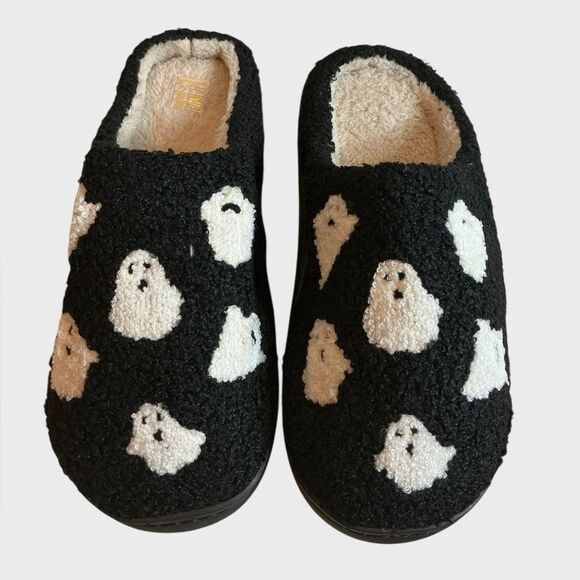 • Black slippers with whimsical white ghost print