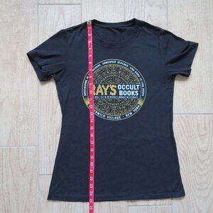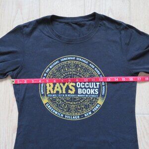 Unbranded black t-shirt with graphic design advertising Ray's Occult Bookstore from the Ghostbusters franchise. No size tag or fabric care tag but I am fairly certain this is a 100% cotton t-shirt in a women's size small. Refer to photos for measurements.