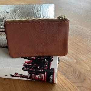 The pouch opens with a durable brass zipper, revealing a clean, lined interior. The attached brass key ring adds to its functionality, allowing you to use it as a coin purse, a compact wallet, or a convenient grab-and-go case for keys, cards, and cash.