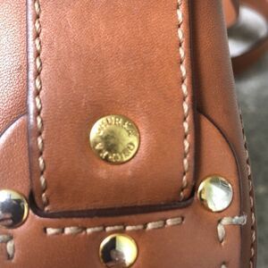 This is a dark tan/light brown handmade in Spain. Please look at the pictures interior has 2 stains. Measuring across the bottom is 7.75 x 6.5 x 2.5. Adjustable strap and measuring at the longest is 20 inches.